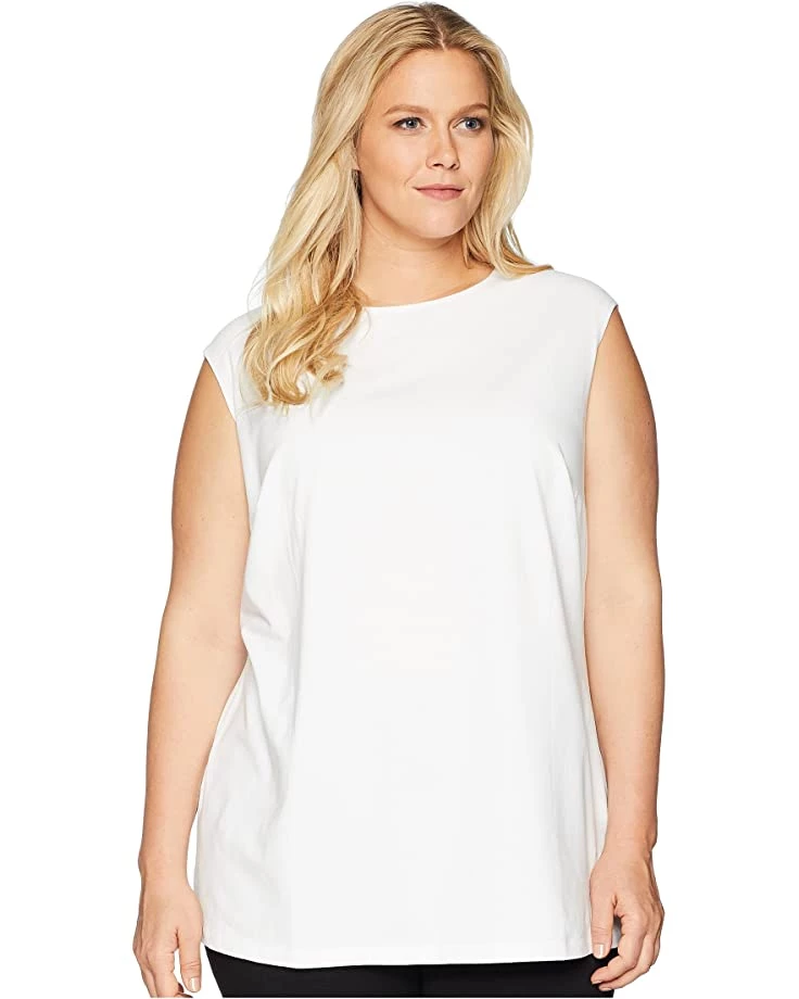 Classic style. Classic fit. Drapes wonderfully and hits at both neckline and hem at a complimentary level. I’m full figured. There is no puckering at the bust. No upward creep of the hem. Fabric appears crisp at all times. I have several in white and black (the only colors offered in Plus), they are wardrobe staples under sheer tops, blazers, pullovers and cardigans. They pack wonderfully and lend themselves to all seasons and climates. Love mine and think you’ll be pleased.