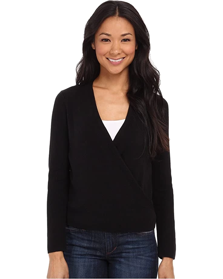 - Wear it open and loose, tied in front, or crisscrossed with the draped overlay secured on the inside or outside.