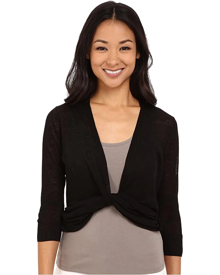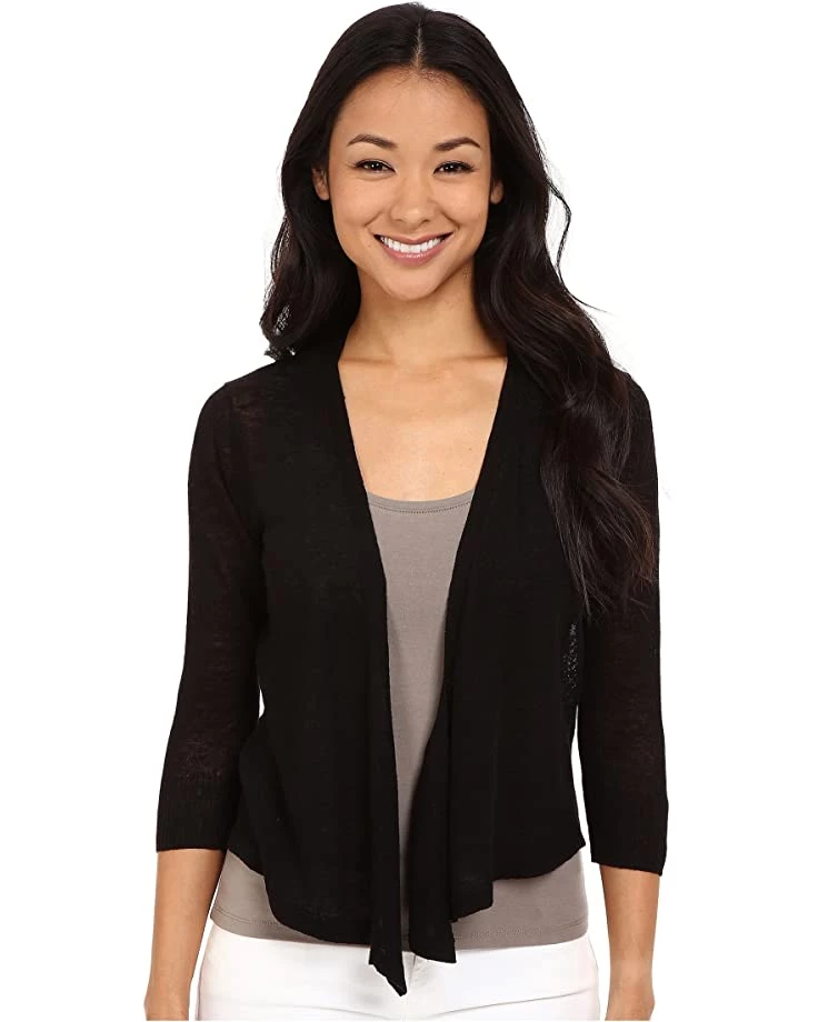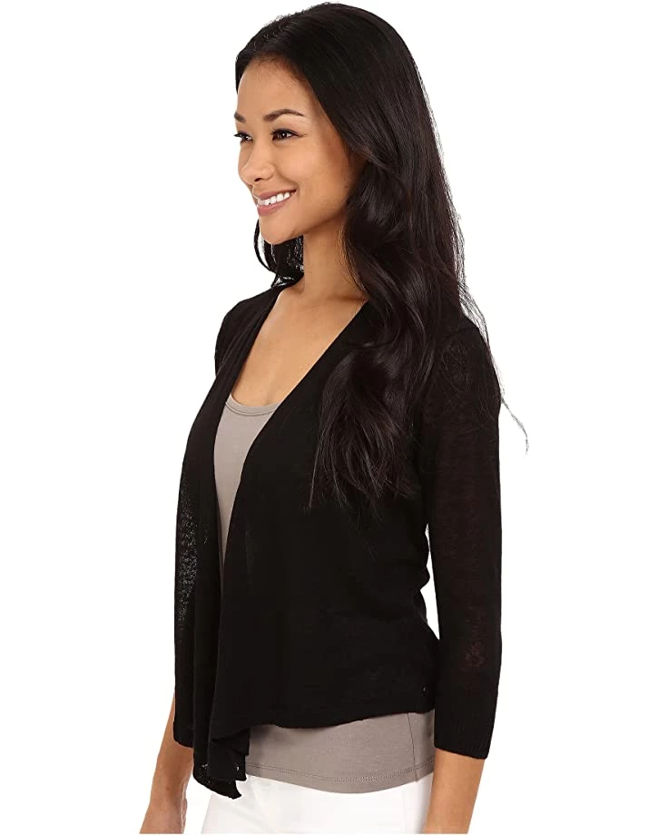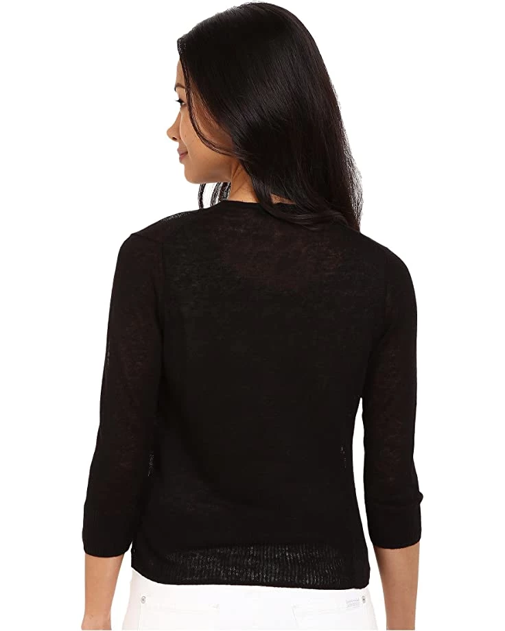 - Solid three-quarter sleeve cardigan in a lightweight and soft knit blend.